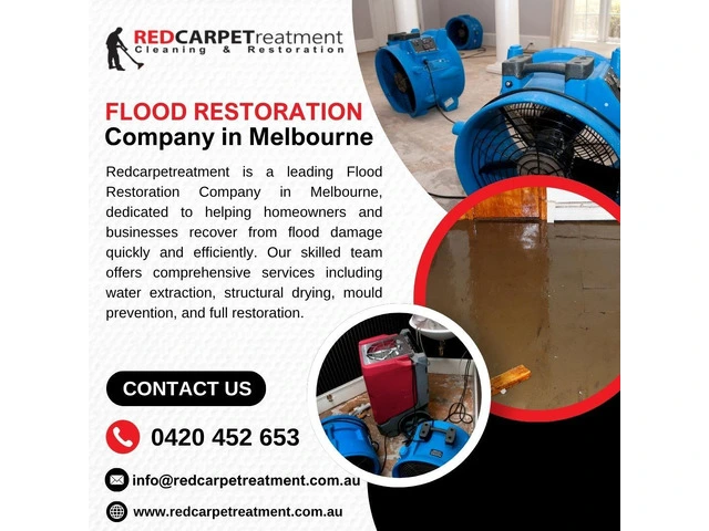 Redcarpetreatment is a leading Flood Restoration Company in Melbourne, dedicated to helping homeowners and businesses recover from flood damage quickly and efficiently. Our skilled team offers comprehensive services including water extraction, structural drying, mould prevention, and full restoration. We understand how stressful flooding can be, which is why we respond promptly to every call, ensuring fast recovery and lasting results. With advanced technology and expert care, Redcarpetreatment restores your property to its best condition while ensuring safety and hygiene every step of the way.